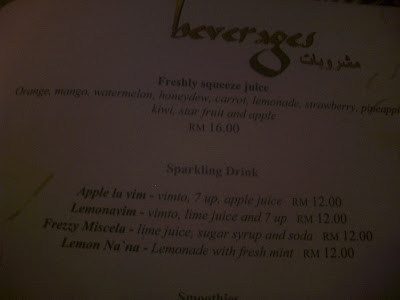 I ordered a Lemonade, wanted to try the Lemon Na’na(which is lemonade with fresh mint) price at RM12, but he give me fresh lemonade(RM16)… Grrr… lemonade with fresh mint sounds more “exotic” than fresh lemonade and it is cheaper too… Anyway… the whole meal for 2 cost RM100(tax included), such an expensive lunch/dinner don’t you think?