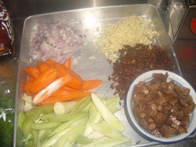 Chopped up: celery, leek, carrot, onion, garlic, sun-dried tomato and chinese sausage.