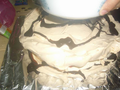 Drizzle chocolate sauce on top of meringue