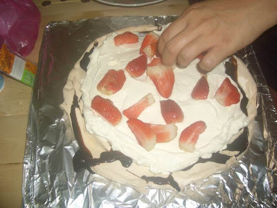 Put a few small slop of whipped cream, then put the second layer of meringue, repeat the step, top with fresh cherry this time instead of strawberry