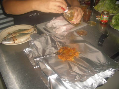 food preparation 2, the fish(to the right at the back) is so fresh and good.