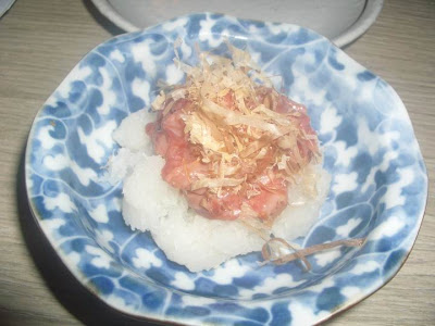 Marinated fish guts, taste quite salty, not repulsive as it may sound, it is ok. The whitish stuff underneath is daikon.