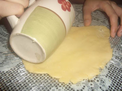 no rollers? no place to roll out the dough? no prob, place a cling wrap on top of tabletop, and use mug to roll out dough.
