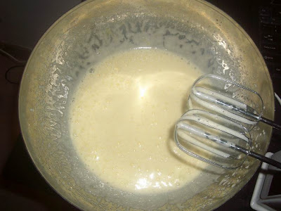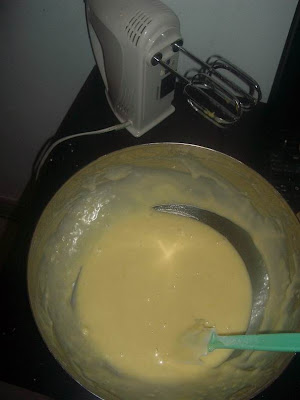Beat the egg + sugar(recipe specified 1 cup sugar, which is about 180g, but i used only 130g of caster sugar), beat till it become pale in color and sugar melted.