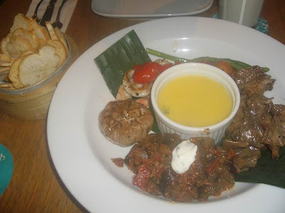 clockwise: grilled seafood with roasted capsicum, asparagus, balsamic tomatoes, mushroom confit, tunisian egg plant and roasted garlic